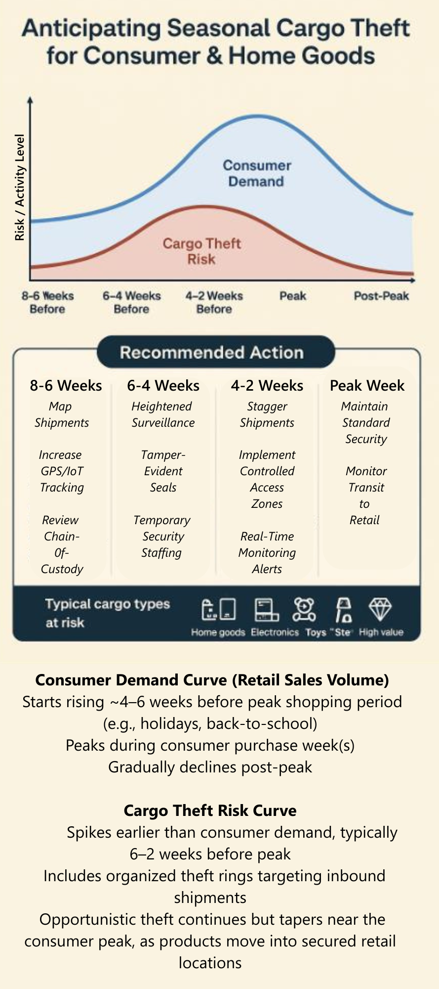 - Retailers often see inventory shrinkage and cargo theft incidents 2–6 weeks before peak sales periods, aligning with warehouse stocking schedules and distribution cycles.